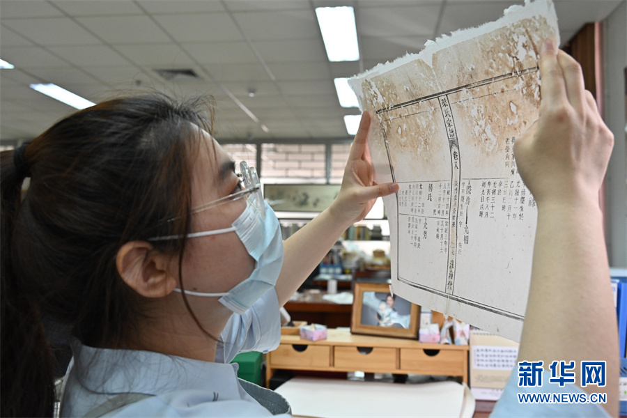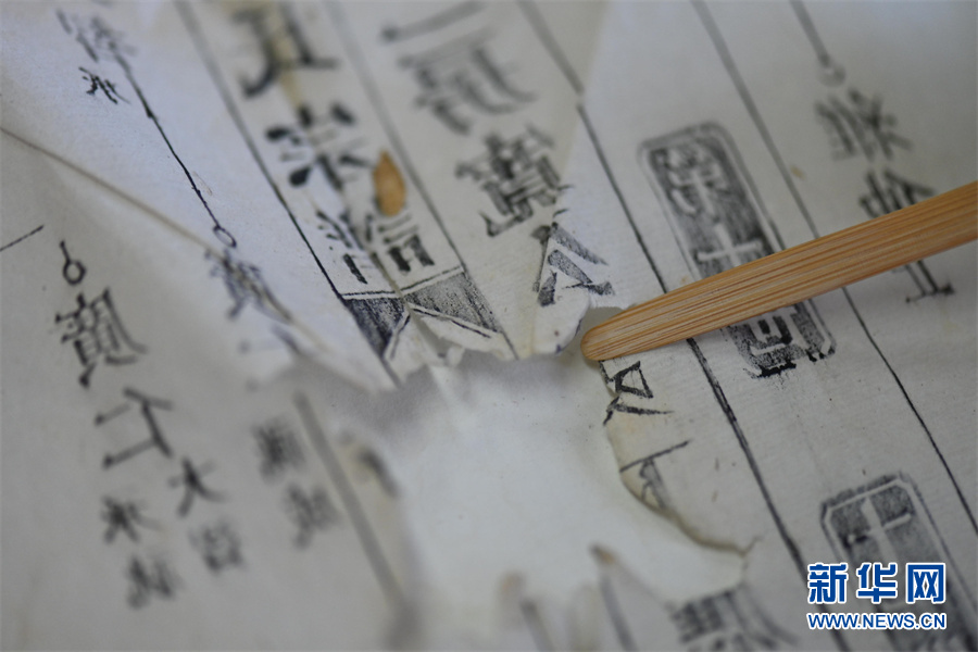 4月24日,蒋云正在修补古籍。新华网发(杨晓原 摄)