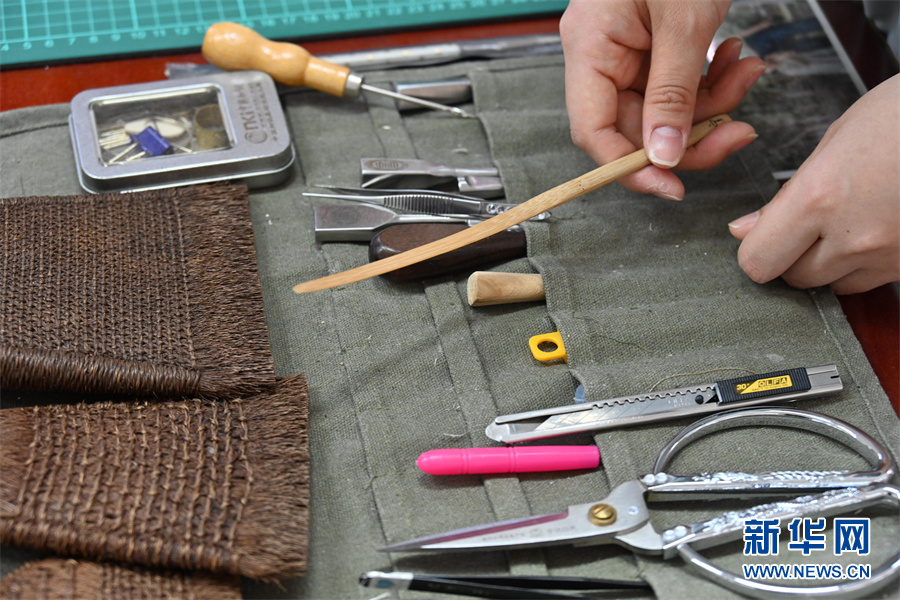 4月24日,蒋云正在整理古籍修补专用工具。新华网发(杨晓原 摄)