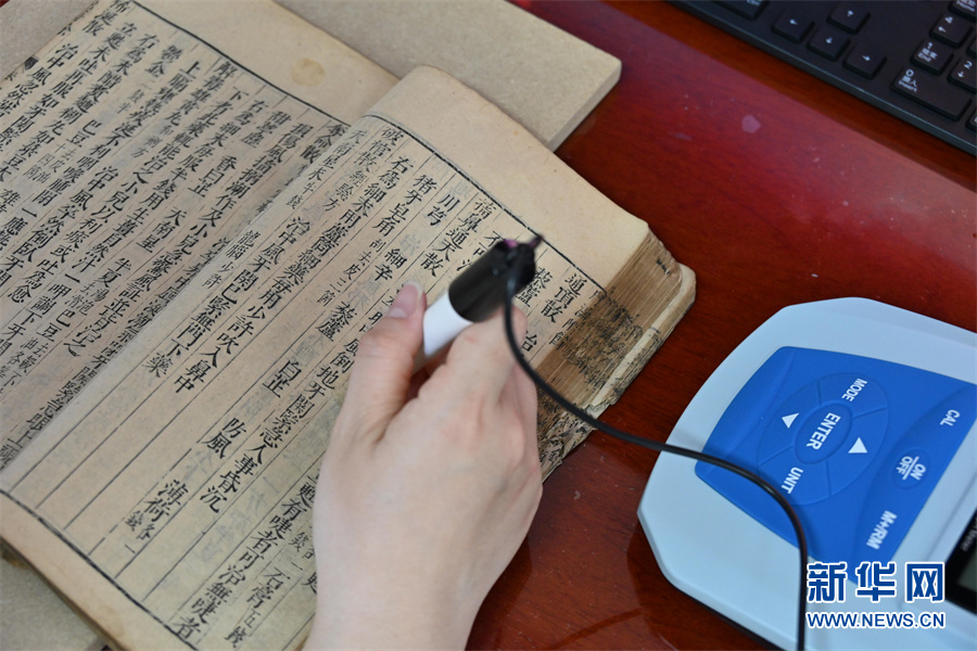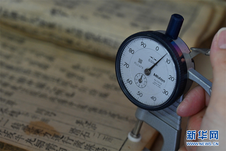 4月24日,蒋云正在用纸张测厚仪测量古籍纸张厚度。新华网发(杨晓原 摄)