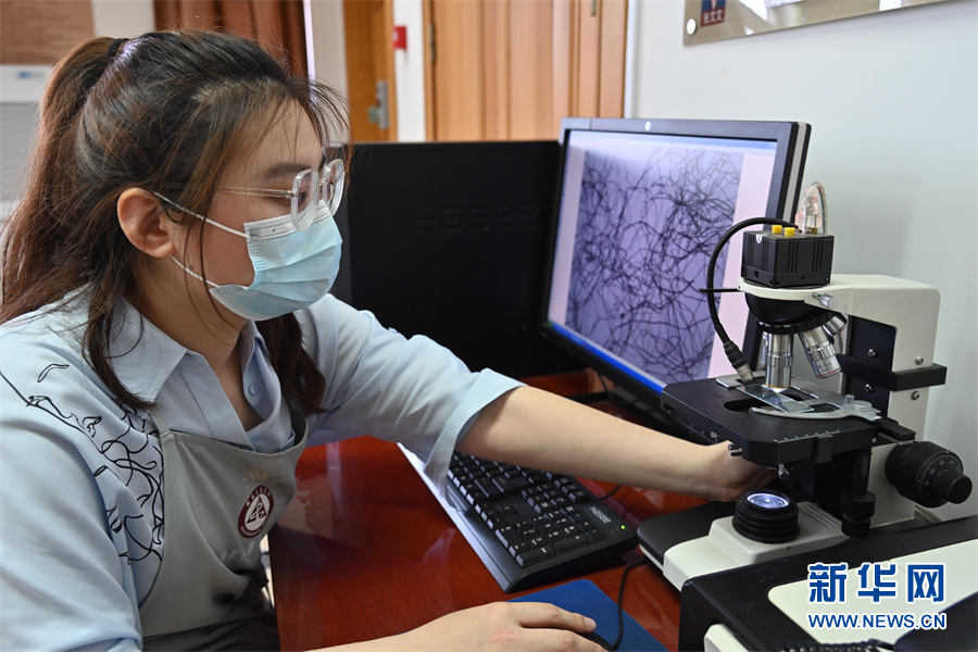 4月24日,蒋云用显微镜观察纸张纤维。新华网发(杨晓原 摄)