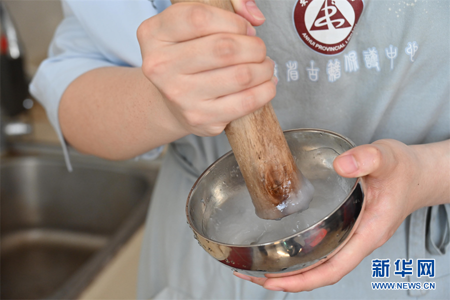 4月24日,蒋云正在手工调制修复古籍用的浆糊。新华网发(杨晓原 摄)