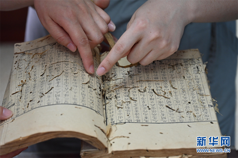 4月24日,蒋云正在查看将要修补的古籍。新华网发(杨晓原 摄)