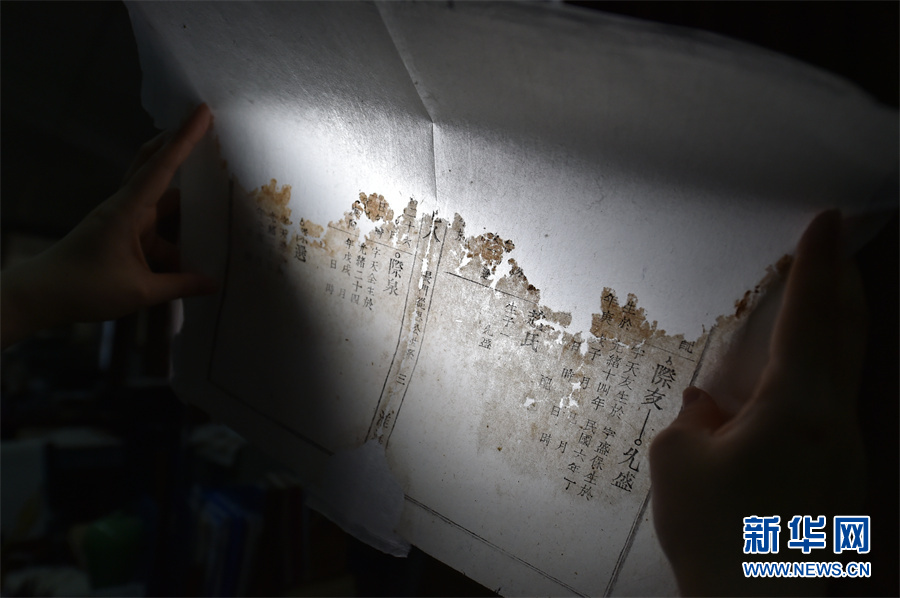 4月24日,蒋云和同事一起查看即将要修补的古籍。新华网发(杨晓原 摄)