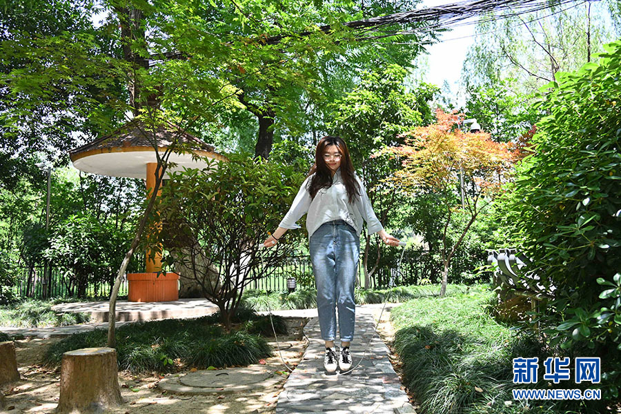 4月24日,下班之后,蒋云跳绳健身。新华网发(杨晓原 摄)
